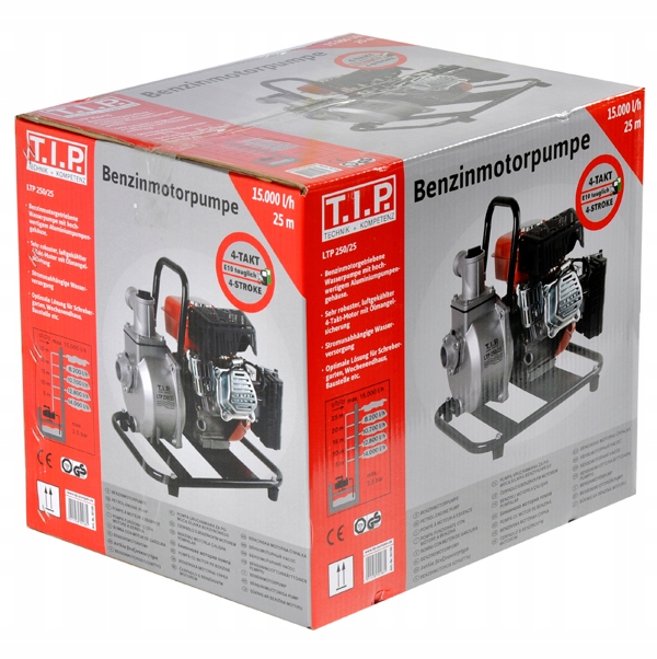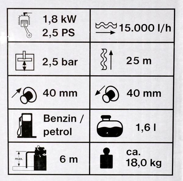 Сільнолитий 4-тактний двигун потужністю 1,8 кВт з повітряним охолодженням. Зі стійкою металевою основою та ручкою. Легко почати. Водопостачання незалежне від електрики. Призначений для стаціонарного та мобільного використання. Оптимальний пристрій для присадибної ділянки, дачі, будівельного майданчика тощо.