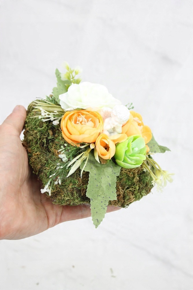 Вся справа у кремово-помаранчевих тонах з додаванням зелене декоративне листя та трави.
