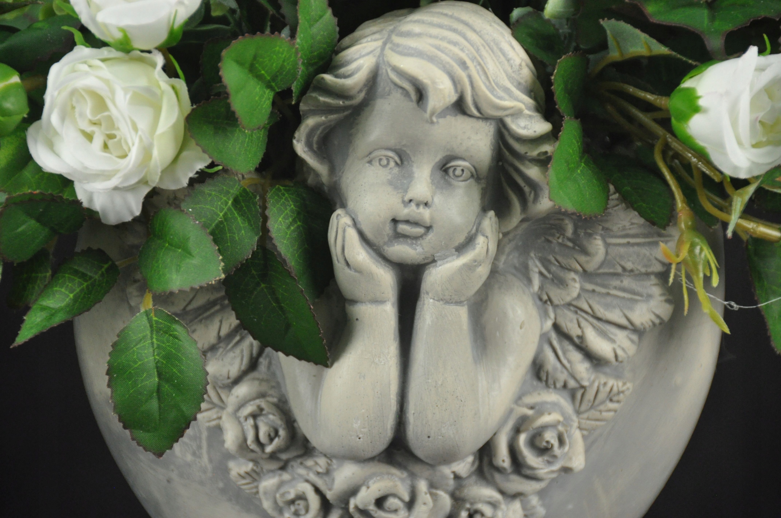 Композиція з білих троянд у вазоні з могилою ангела