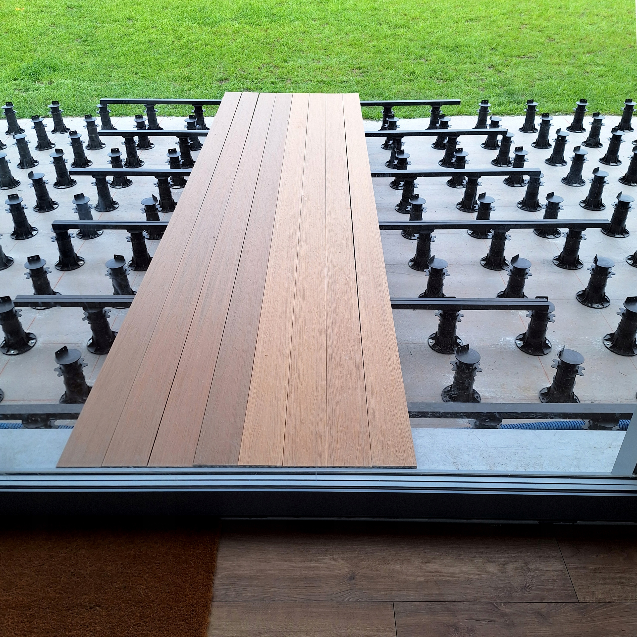 Композитна дошка Premium Composite нового покоління – це високоякісний продукт. Завдяки сучасній технології виробництва дошка має характерну структуру натурального зерна дошки. Деревний візерунок наноситься на поверхню за допомогою пресів при високих температурах із зовнішнім полімерним покриттям, яке оточує дошку з усіх боків і захищає її від плям і втрати кольору. Завдяки цьому методу виробництва він також міцний і стійкий до стирання. Дошка двостороння та двоколірна, ви можете розташувати її як завгодно. Крім того, внутрішня структура плити значно жорсткіша та стійкіша до механічних пошкоджень завдяки використанню спеціального перерізу круглих камер та високій щільності композиту.