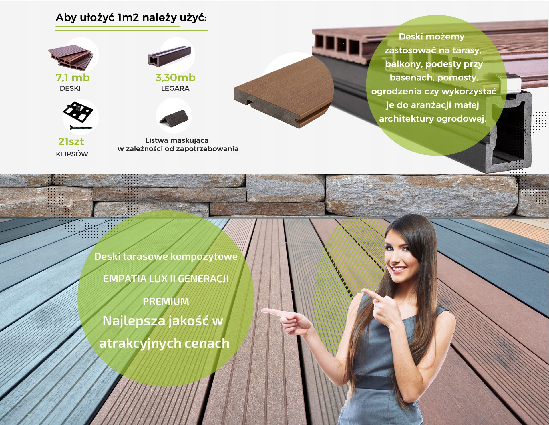 Ціна ЛИШЕ 39,90 злотих за погонний метр дошки - ЦІНА ЗА КОЛІР АНТРАЦИТ/ГРАФІТ. Ціна за 1 метр плити Dark Brown/Teak 41,90 злотих Ціна за м2 дошки 289 злотих. Ціна всієї системи за м2 / дошки, композитні балки 32х42 мм, металеві скоби з шурупами/ 379 злотих. Ціни брутто включають 23% ПДВ.