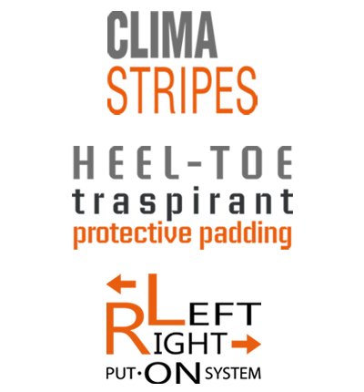 - технології: No-Stress Cuff-System, Outer Phalanges Pad, Integra Tech Structure, Talo-Navi Protection, Inner Thumb Pad, X-Tra Fine Seams, Heel Sys Dressing, Meta Tarsus Pad, Anatomical Knuckles Protective Dry-Pad, Grip-Tech Plant Pad, Anatomically Toe Fitting, Dry-Tech Flow, Clima Stripes, Heel-Toe Traspirant Захисна підкладка, система надягання ліворуч-праворуч, захист від розтягування зв’язок із низьким плетінням, захист від розтяжок