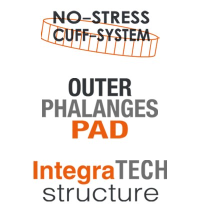 - технології: No-Stress Cuff-System, Outer Phalanges Pad, Integra Tech Structure, Talo-Navi Protection, Inner Thumb Pad, X-Tra Fine Seams, Heel Sys Dressing, Meta Tarsus Pad, Anatomical Knuckles Protective Dry-Pad, Grip-Tech Plant Pad, Anatomically Toe Fitting, Dry-Tech Flow, Clima Stripes, Heel-Toe Traspirant Protective Padding, Left-Right Put-On System, Sta By Low Weaving Containment Antisprain, Tendy on Guards