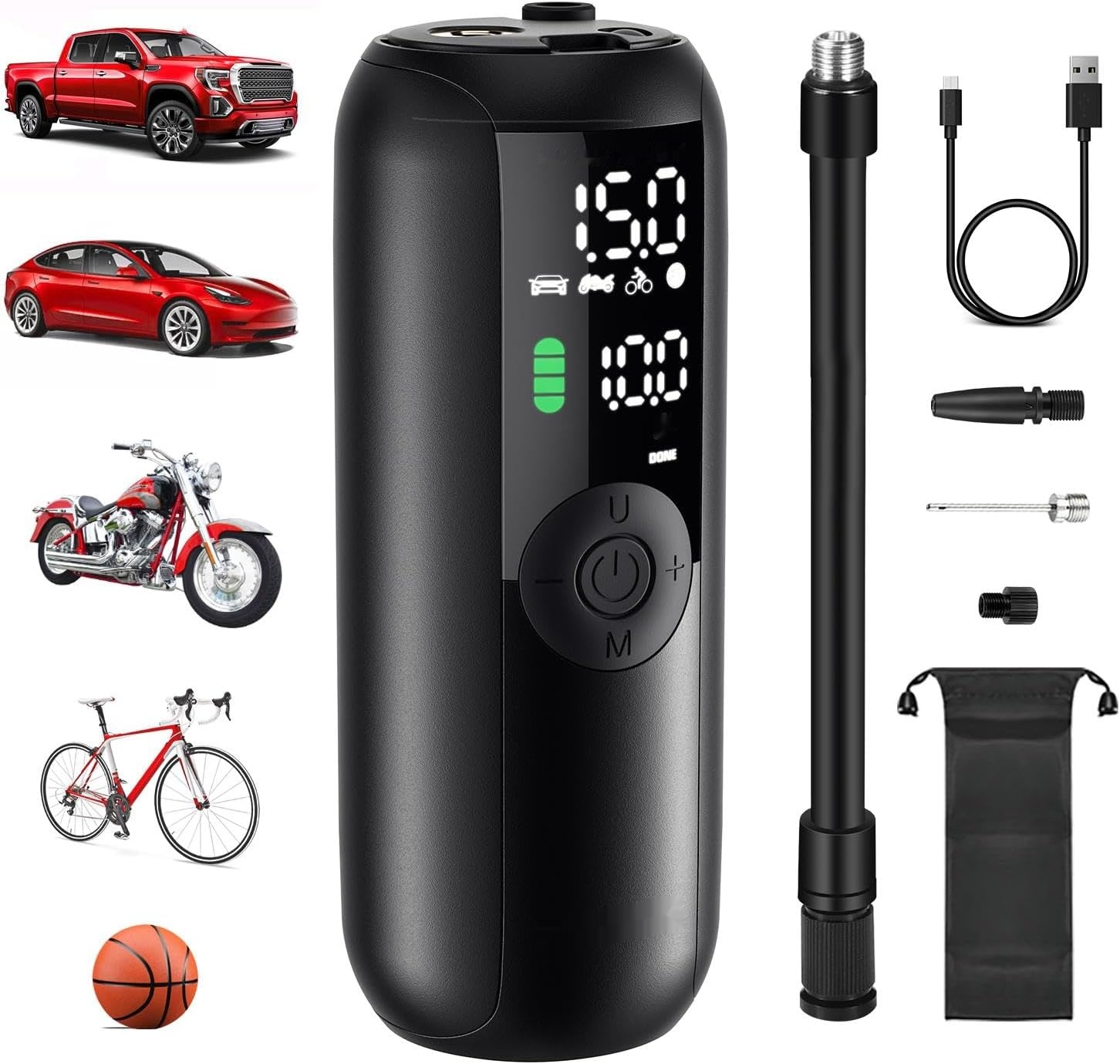 - Комплексне використання: Завдяки безлічі адаптерів клапанів його можна використовувати для перекачування автомобілів, велосипедів, мотоциклів та спортивних кульок.