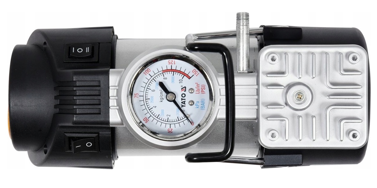 Оригінальний потужний компресор з точним манометром з напругою живлення 12 В від відомого бренду YATO. Призначений для накачування коліс і камер, обладнаних клапаном, в автомобілях, мотоциклах і велосипедах, а також - за допомогою змінних наконечників - матраців, понтонів і м'ячів.
