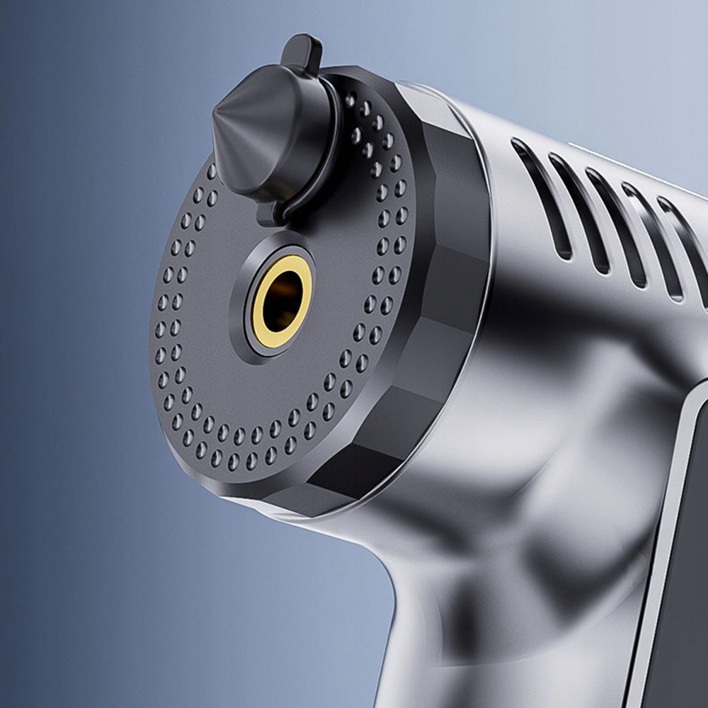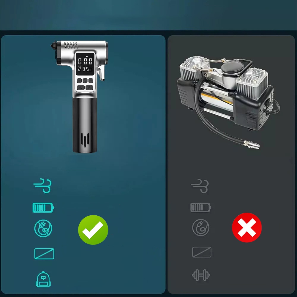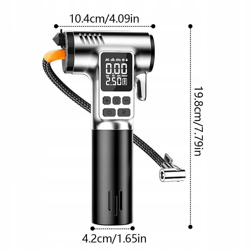 Електричний повітряний насос виготовлено з високоякісного матеріалу ABS, який є міцним і довговічним. Має ефективний акумулятор, який можна швидко заряджати через порт USB. Зручний футляр розміром 10,4 x 19,8 x 4,2 см дозволяє легко зберігати його в автомобілі.