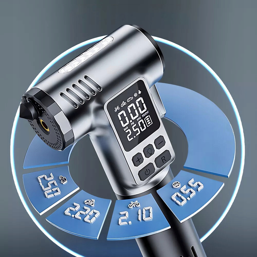 Портативний насос для накачування автомобільних шин має функцію вимірювання тиску повітря з точністю до 1 PSI і підтримує 5 режимів (автомобіль, мотоцикл, велосипед, м’яч і вуличний режим). Виберіть бажаний тиск із чотирьох одиниць вимірювання (PSI, бар, кПа, кг/см²). Електричний насос автоматично зупиняється при досягненні цільового тиску. Завдяки цьому вам не доведеться турбуватися про гіпертонію.