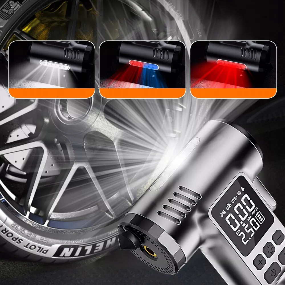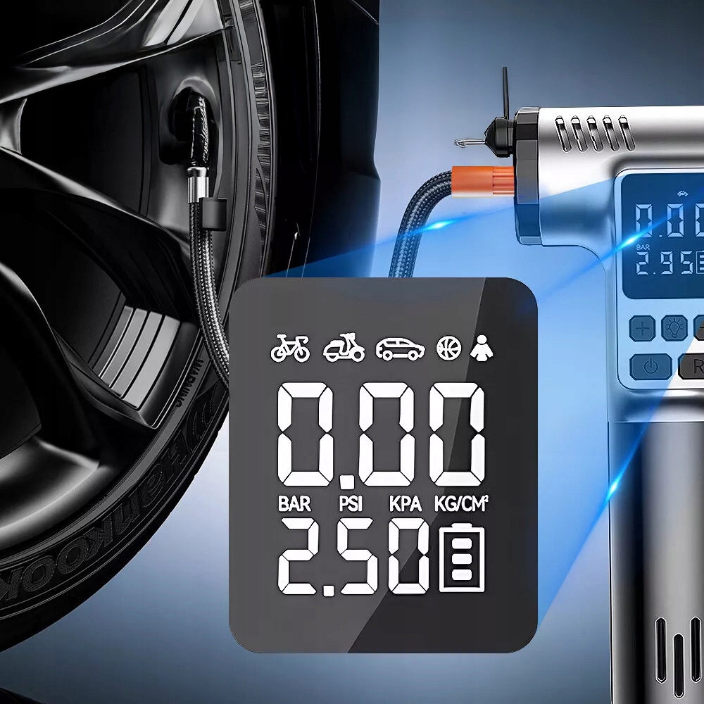 Автомобільний компресор шин обладнаний РК-екраном високої чіткості, який чітко відображає значення тиску в шинах, режим, рівень заряду акумулятора та іншу інформацію. Верхня частина насоса також оснащена 3 світлодіодами з функцією SOS і незалежним перемикачем, що полегшує використання в екстрених ситуаціях.