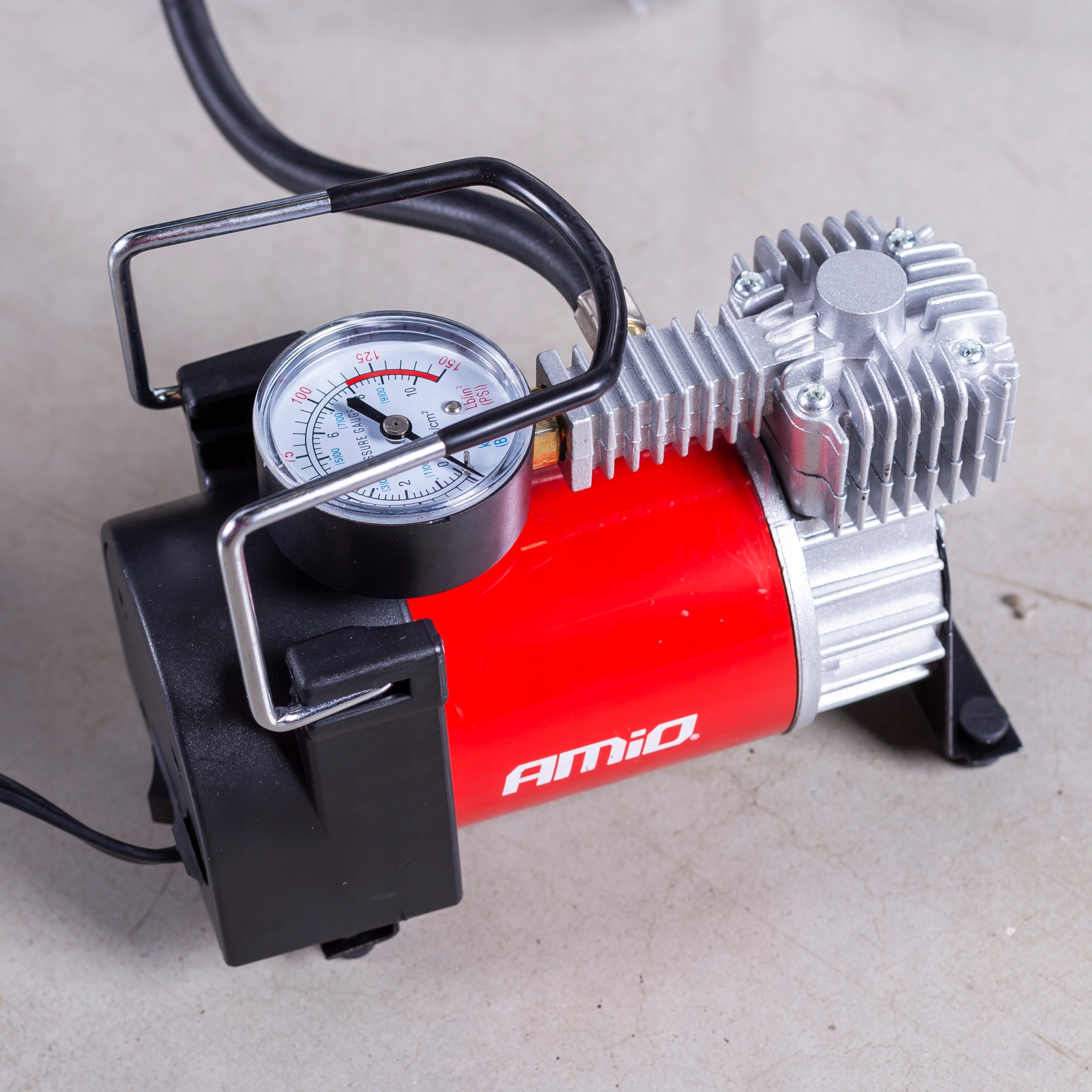 Компресор автомобільний з манометром. Пристрій має міцний металевий корпус з гумовими ніжками, які усувають вібрацію під час роботи компресора.