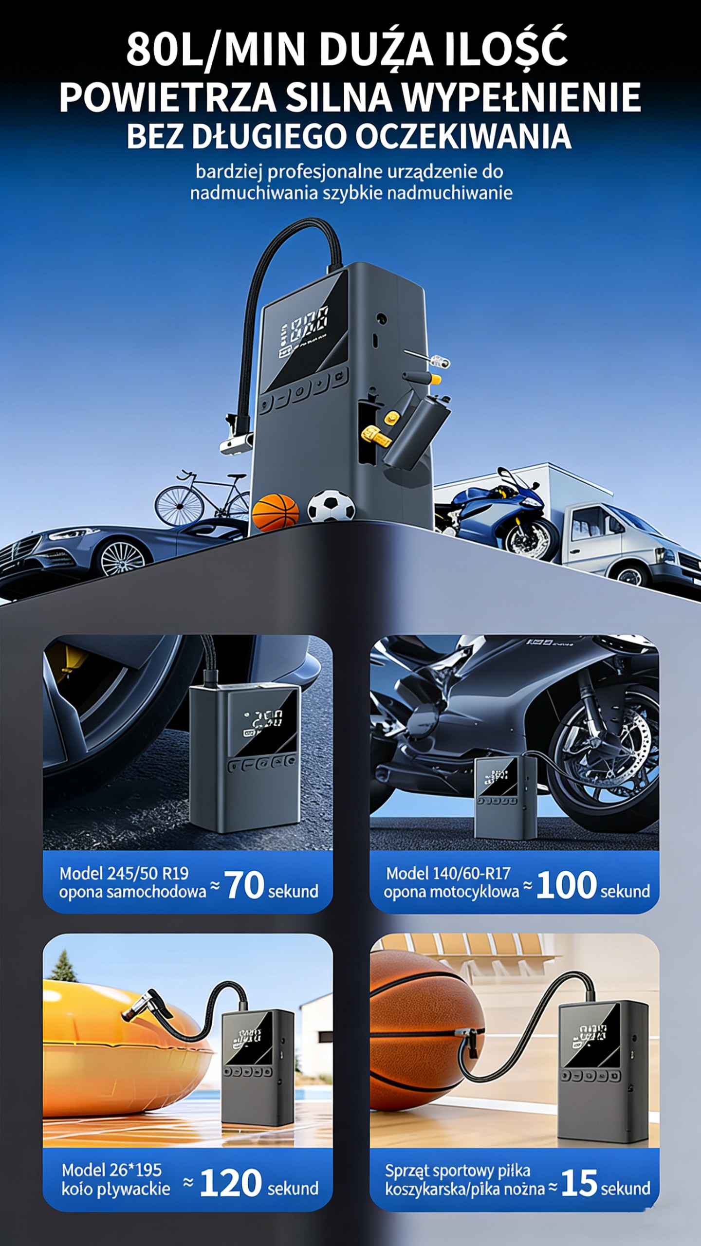 ➡️ Виберіть із 4 інтелектуальних режимів: автомобіль, велосипед, мотоцикл і м’яч – кожне налаштування було оптимізовано для конкретних потреб, що робить надування швидким і безпечним.
