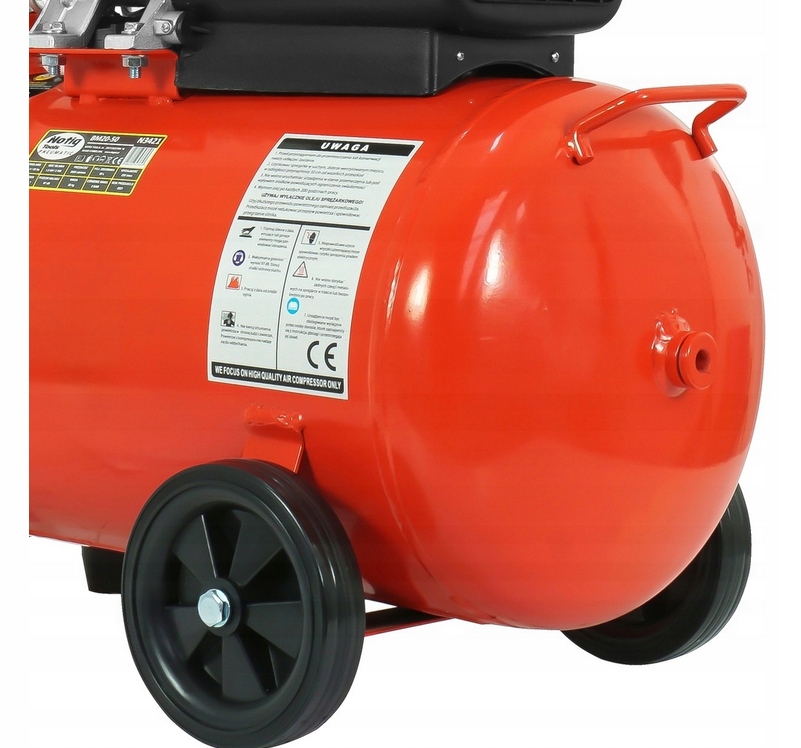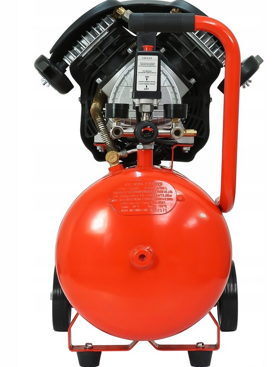 Мобільність компресора на роботі забезпечується суцільними гумовими колесами та ручкою для транспортування компресора. Завдяки великим твердим колесам його можна легко перевезти в потрібне місце.
