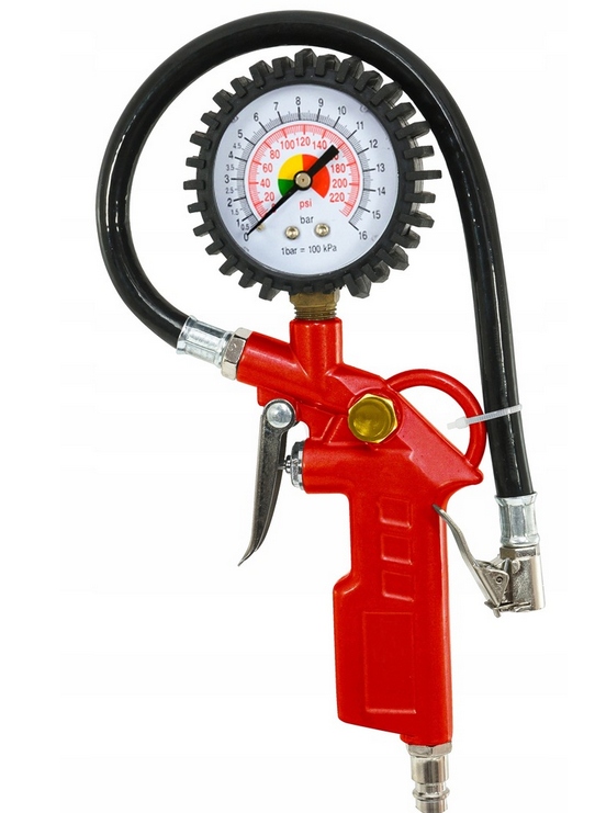 Покачання пістолета з манометром під тиском ідеально підходить для перекачування та управління тиском пневматичної шин. У ньому є корпус гумового годинника. Він оснащений повітряним клапаном.
