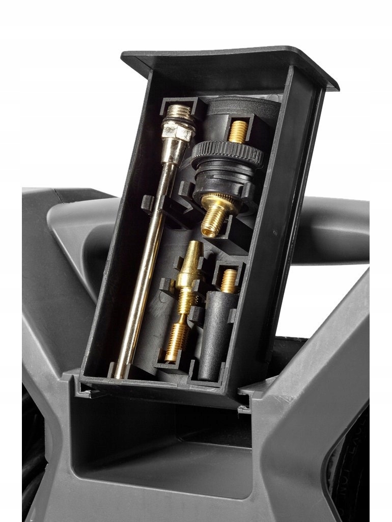 Компресор має вбудований напірний шланг довжиною 3 метри, набір наконечників для насоса та 2 -в-1 насосний пістолет з манометром, а після зміни наконечника в комплекті - для продування.