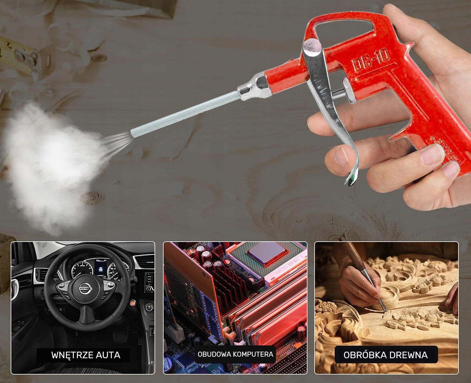 Незамінний для видалення пилу, піску, стружки тощо за допомогою стисненого повітря. Ідеально підходить для видалення забруднень із машин, пристроїв і двигунів.