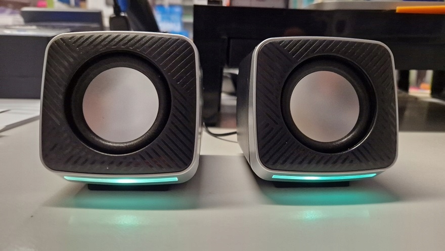 Високоякісні стереодинаміки для ноутбуків і настільних комп'ютерів з світлодіодним підсвічуванням RAINBOW. Вони гарантують чистий і природний звук б > звук. Працюють з усіма комп'ютерами з виходом на динамік і USB-виходом. Вони мають вбудований регулятор гучності. Високоякісні матеріали, які використовуються у виробництві, захищають від статичної електрики та генерації електромагнітних перешкод.