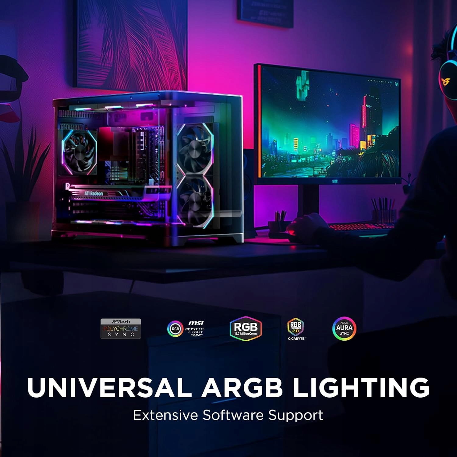 - ARGB-Sync: наш 120-міліметровий RGB-вентилятор для настільного ПК не лише вражає своєю продуктивністю, але також підтримує 16,8 мільйонів кольорів світлових ефектів ARGB і забезпечує користувачам найкраще візуальне враження. Цей вентилятор підтримує налаштування різних кольорів, колірних температур і рівнів яскравості, відповідаючи вашим очікуванням персоналізованих світлових ефектів. Що ще важливіше, він сумісний із програмним забезпеченням керування M/B, таким як Asus Aura Sync, Gigabyte RGB Fusion і MSI Mystic RGB Sync.