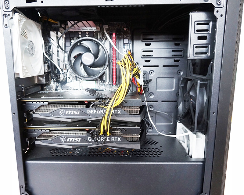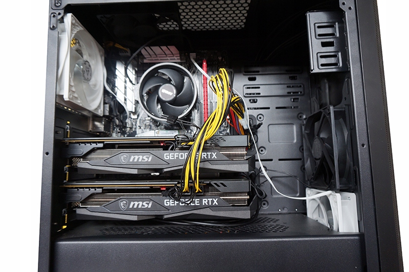 Фірмова материнська плата ATX у версії PCI-E x16 v. 3.0 із розподілом ліній 8/8, необхідна для роботи 2 карт RTX 3060 на повній швидкості. Інакше ми б не отримали стільки MH з 2 карт, потенціал карт був би витрачений. Ці плати рідко зустрічаються на ринку і лише найвищі моделі з високими чіпсетами (але не всі), їх також зазвичай важко придбати. Більше карток не помістяться в цей тип корпусу RTX 3060 і можуть бути нерентабельними. Краще і вигідніше у випадку з картами 3060 купити ще один комп'ютер і поставити його поверх іншого або поруч з ним, звісно забезпечивши достатньо місця для охолодження. Сам набір добре охолоджується ефективними вентиляторами, також для безперервної роботи, забезпечуючи достатню циркуляцію повітря на вході/виході. Набір не потрібно підключати до монітора, завдяки відповідним адаптерам, які імітують роботу монітора, що необхідно у випадку з RTX 3060.