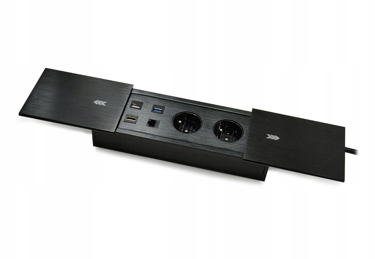 Медіапорт – сучасне рішення. Виготовлений з алюмінію та високоякісних компонентів. Окрім стандартних розеток живлення, він також має порти USB 3.0, USB 2.0, HDMI та роз’єм Ethernet RJ-45, усі закриті двома розсувними алюмінієвими кришками.
