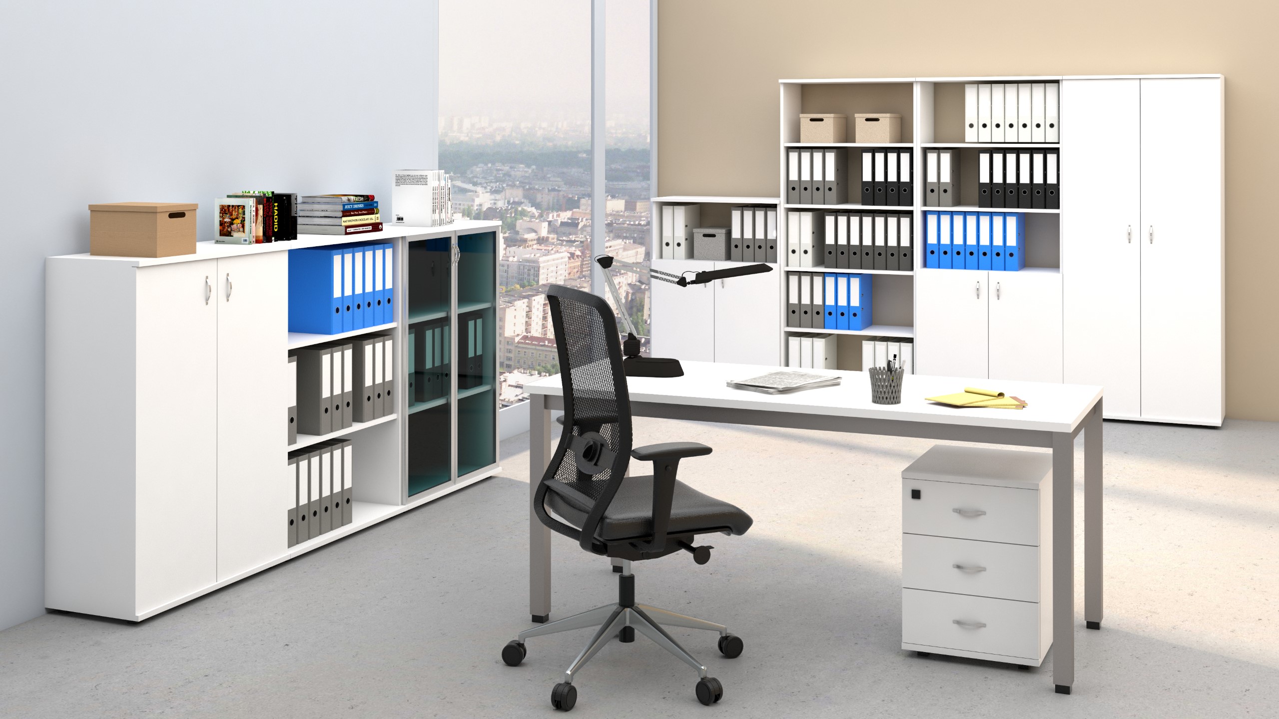 Офісна система характеризується високою функціональністю та естетичністю. Меблі виготовлені з високоякісних матеріалів як польських, так і іноземних виробників. Для виготовлення офісних меблів ми використовуємо ламіновану меблеву плиту товщиною 18 мм і 25 мм (для стільниць). Краї елементів покриті АБС-кантом товщиною 0,5 мм і 2 мм у випадку стільниці відповідно.