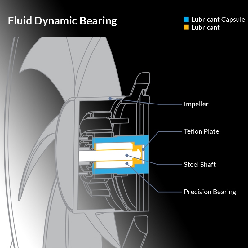 Завдяки комбінації сплаву та мастила, розробленій у Німеччині, тертя в підшипнику зменшено, що підвищує ефективність. Це виділяє менше тепла, зменшує шум підшипників і подовжує термін служби вентилятора.