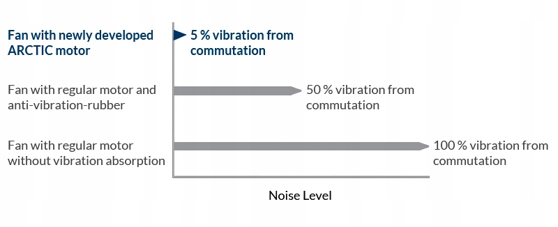 Навіть на низьких швидкостях звук нового двигуна ARCTIC ледве чутний. Завдяки синусоїдному намагніченню новий двигун створює лише близько 5% комутаційних коливань звичайного нефільтрованого двигуна постійного струму. Отже, немає необхідності використовувати гумові прокладки завдяки постійному та плавному крутному моменту нового двигуна.