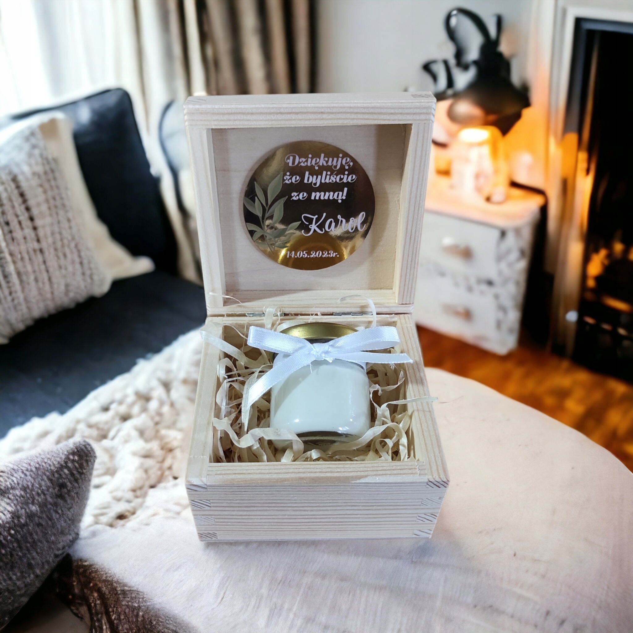 - крім того, коробка містить соєву свічку ручної роботи, зав’язану атласним бантом < /ul>