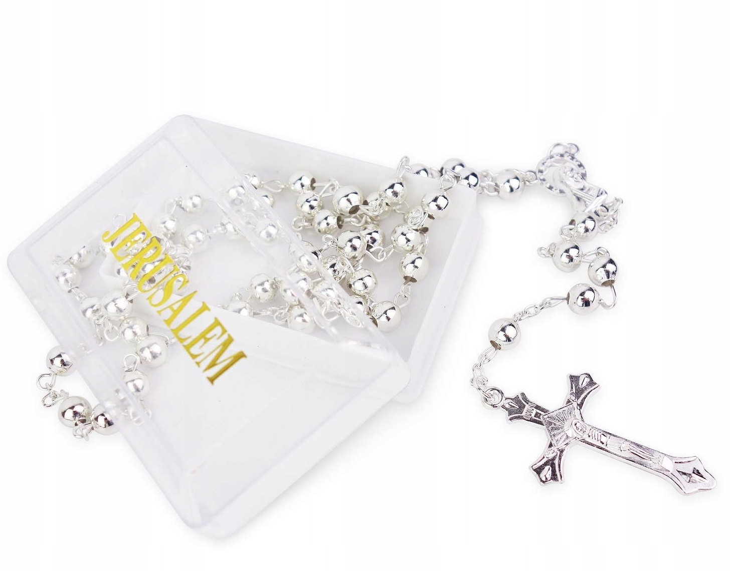 Пластикові чотки сріблястого кольору. Розарій починається металевим папським хрестом, у з’єднувачі – Непорочна Діва Марія та Пресвяте Серце Ісуса. Намистини розарію з'єднані дротом з нержавіючої сталі. Вервиця упакована в пластикову коробку з прозорою кришкою та написом ЄРУСАЛИМ.