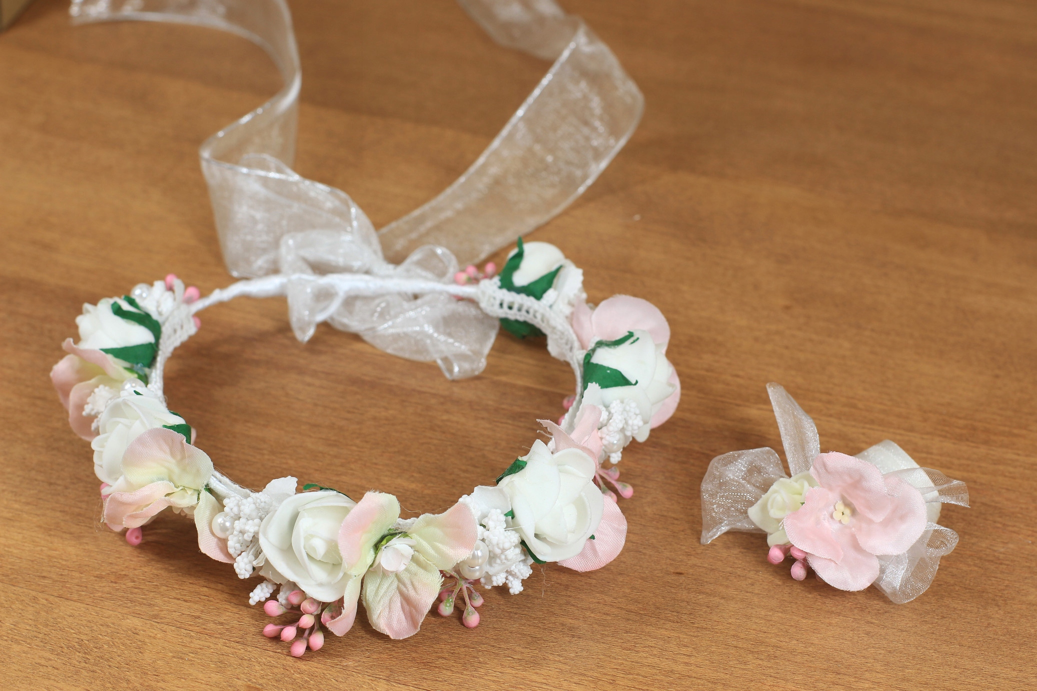 Вінок на голову з біло-рожевими квітами + браслет - 100% ручна робота.