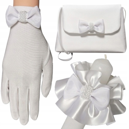 Біла тришарова сумка для причастя з першокласного весільного атласу, напівматового, жорсткого тюлю та жорсткої тканини CAMBEL. Сумка має ручку з білої стрічки grosgrain довжиною приблизно 96 см. Така довжина дозволяє легко одягати сумку через плече. Цей продукт ідеально підходить для людей, які віддають перевагу елегантній простоті.