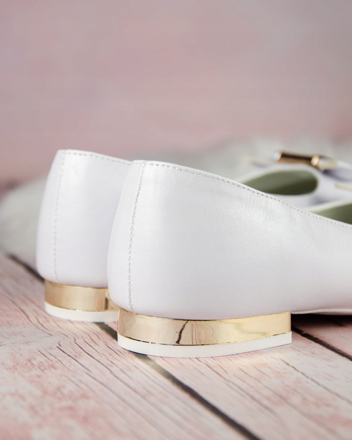 Елегантні білі туфлі для причастя для дівчат. Взуття має гарну форму, тому надійно облягає ногу. Модель має ніжний каблук висотою 1,5 см, золотого кольору. Красивий бантик із золотим декором додає їм шарму. Зовнішня частина взуття виготовлена з екологічної шкіри, а устілка - з натуральної шкіри. Класичні балетки ідеально підходять для Першого Святого Причастя, інших урочистостей тощо.