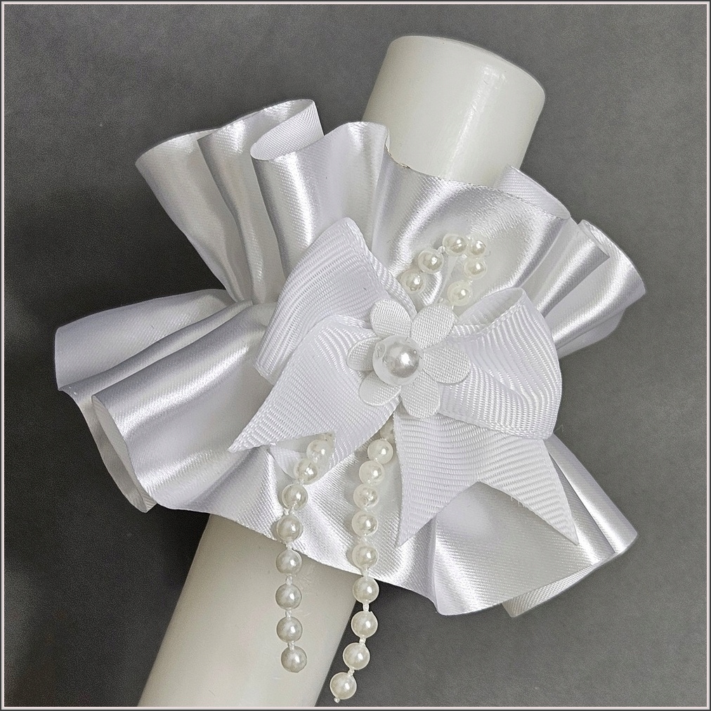 2in1 Drip cap та декор для свічки для причастя чи хрещення. Виготовлена з атласної стрічки ПРЕМІУМ, шириною 8 см, прикрашена бантиком з грогрена з атласною квіткою з перлиною.
