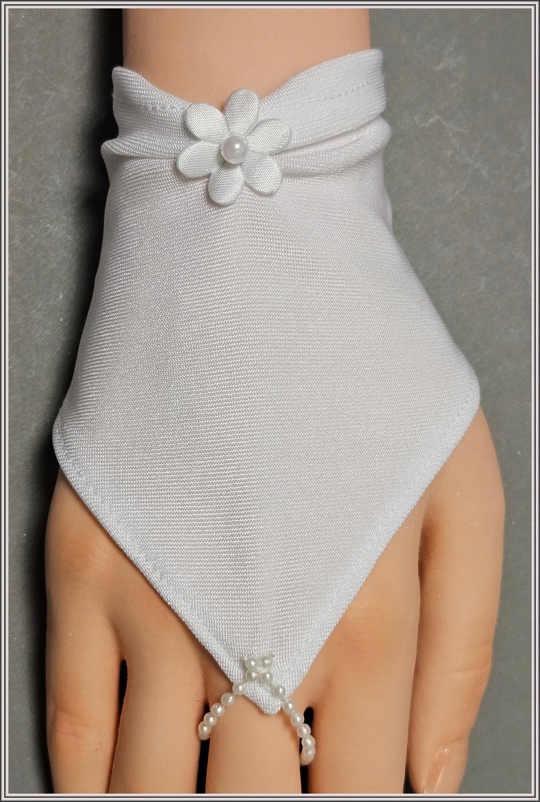 Білі еластичні рукавички для причастя для дівчаток, прикрашені атласною квіткою з перлиною. Розміщуються на одному пальці.