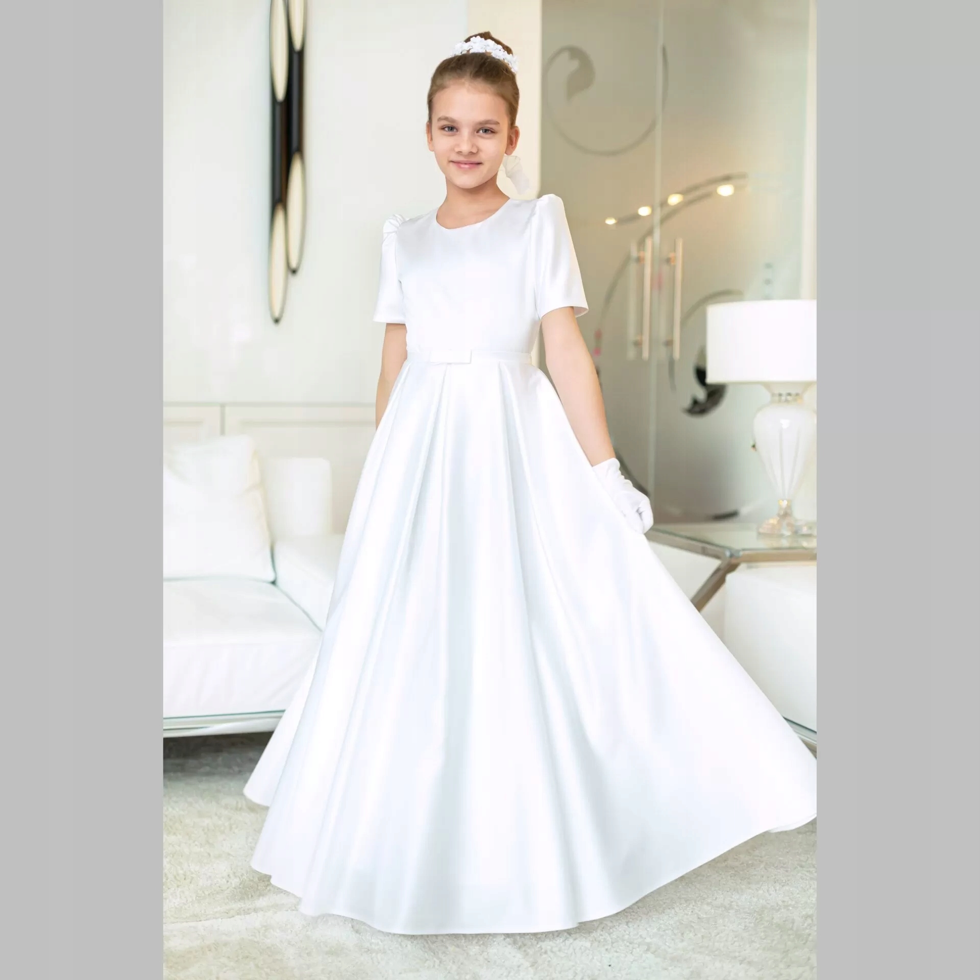 з атласу - ідеальний вибір для кожної дівчини. Це біле гладке плаття для причастя PLISA - класична модель з білого атласу з ніжним бантом на талії. Просте гладке плаття для причастя PLISA, яке характеризується простотою та елегантністю, має можливість додати каблучку, щоб зробити його ширшим.