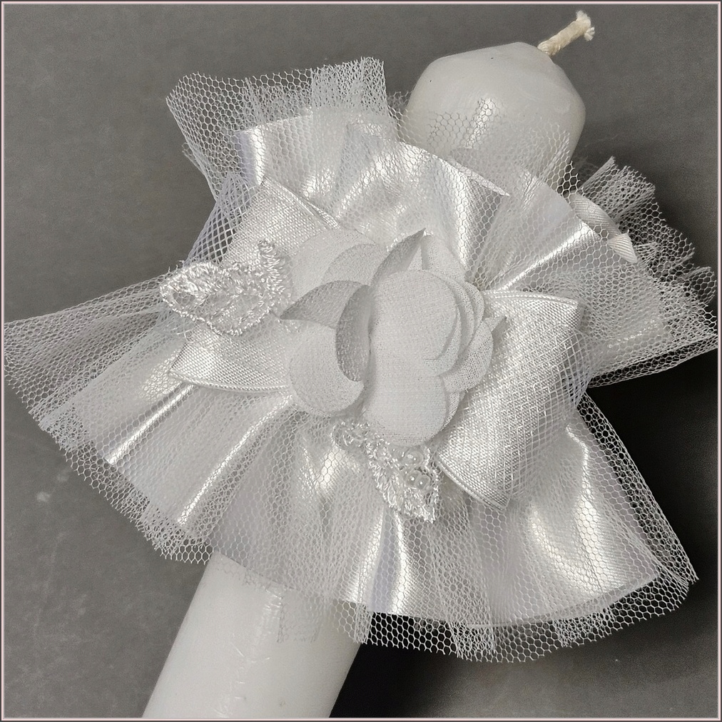 Накопичувач з атласу та тюлю для свічки для причастя чи хрещення, прикрашений 3D мереживною аплікацією.