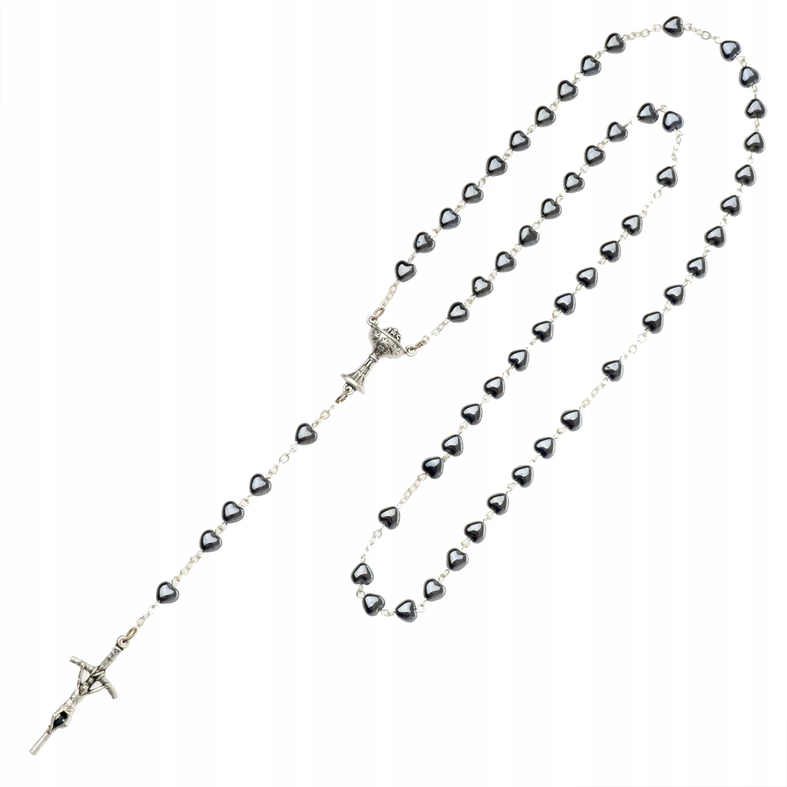 - Вервиця для хлопчика з нагоди Першого Причастя, виготовлена з графітових намистин у формі серця діаметром 5 мм, з повним набором із 5 таємниць.