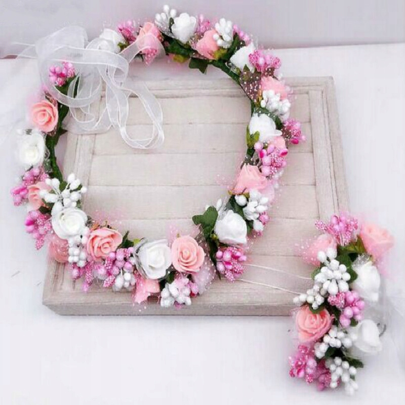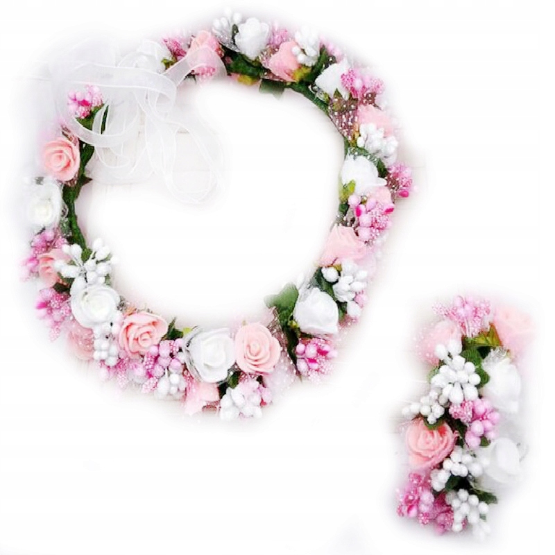 Гарний віночок із білосніжними та рожевими квітами та зеленим листям, доповнений ручним декором.