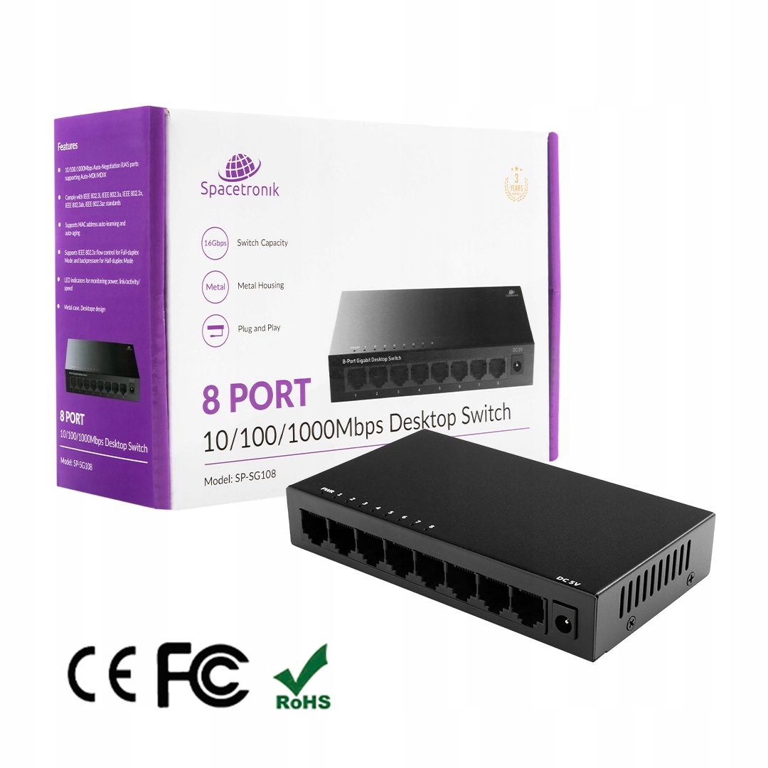 КОМУТАЧ 8-портовий мережевий комутатор GIGABIT LAN Spacetronik SP-SG108