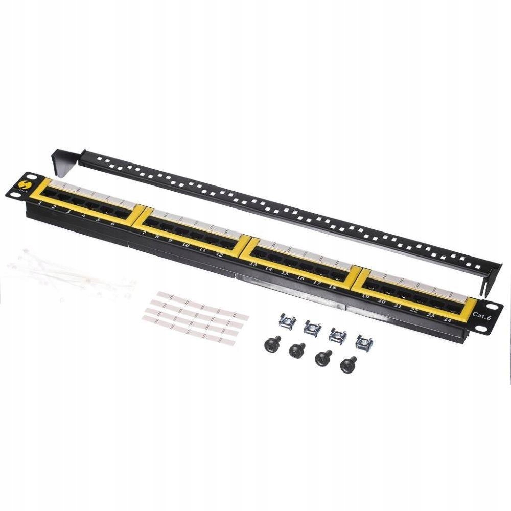 Додаткова інформація: Порти, розташовані в 4 групи по 6, Роз’єми для підключення штекерів RJ45 UTP на передній панелі, Роз’єми для під’єднання кабелів на ззаду, тип Dual Block, Z. Номер порту та спосіб підключення кабелів описані на задній частині роз’єму. Для під’єднання кабелів використовуйте патч-ніж. типу Krone або IDC 110, Полиця для розміщення кабелів на задній частині патч-панелі, Гачки для кріплення джгута проводів, Опис портів - пластикові вікна для вставлення паперових описів