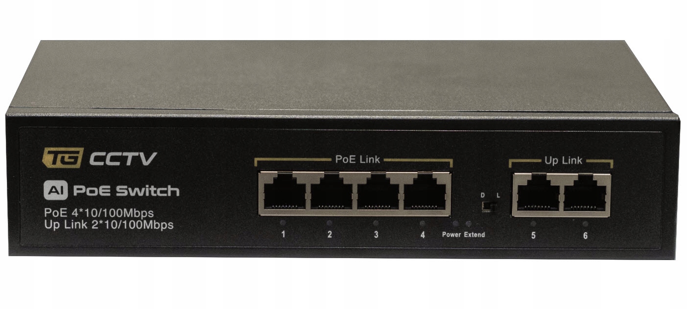 Комутатор, оснащений 6 портами LAN, включаючи 4 порти PoE зі швидкістю 10/100 Мбіт/с, що забезпечує передачу даних і живлення в 802.3af/ стандартний протокол на, із загальним бюджетом потужності 65 Вт.