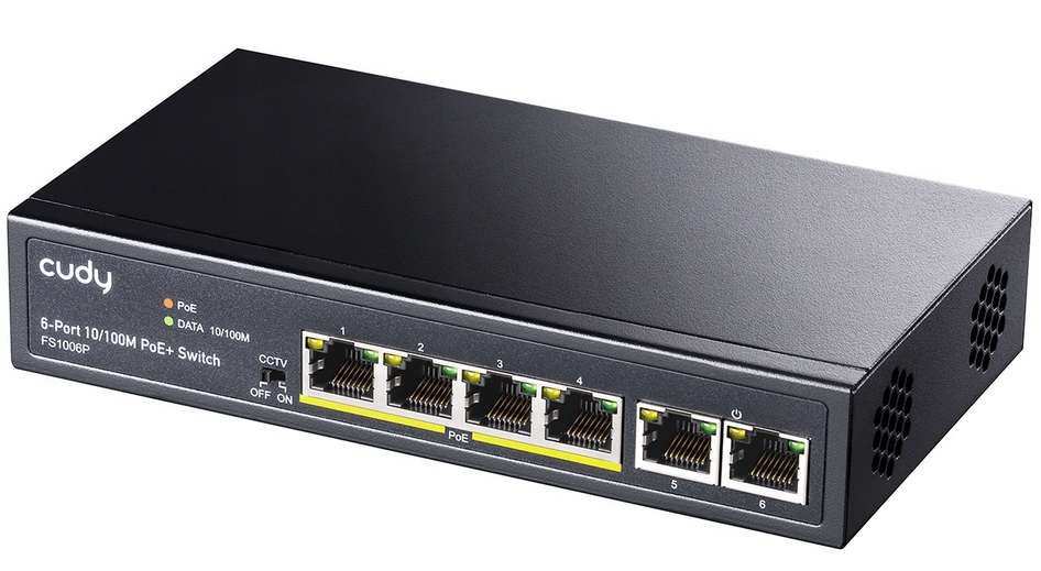 Cudy PoE комутатор не тільки дозволить нам поширювати інтернет-сигнал на різні пристрої, але й забезпечить їх живленням. Комутатор має 6 портів зі швидкістю 10/100 Мбіт/с (включаючи 4 порти PoE), тому ми можемо підключати багато пристроїв, не турбуючись про швидкість передачі даних.
