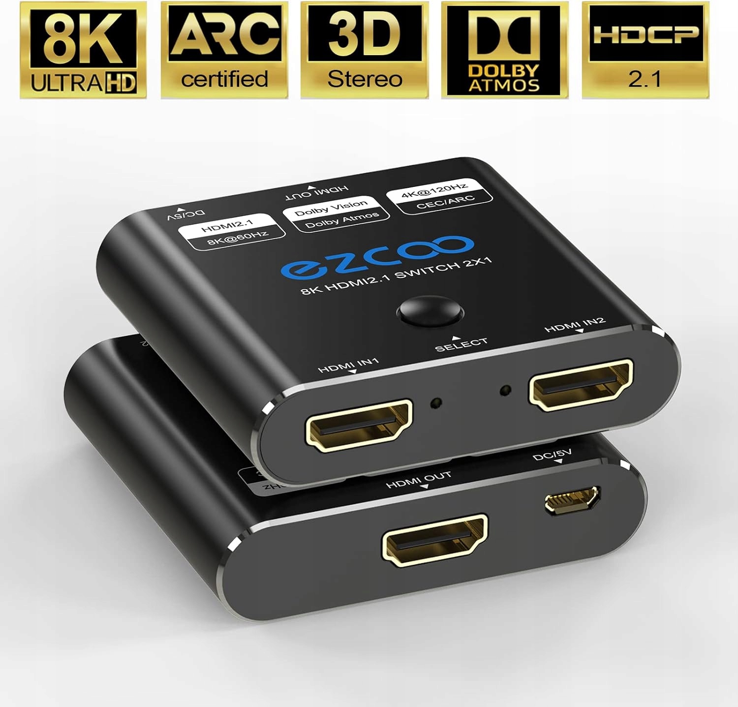 - ✅Перемикач HDMI 2.1 2-в-1 підтримує 8K@60Hz, 4K@120Hz, 1080P@240Hz, HDR, HDCP, CEC, ARC зі швидкістю передачі до 48 Гбіт/с і зворотно сумісний з усіма попередніми HDMI стандарти.