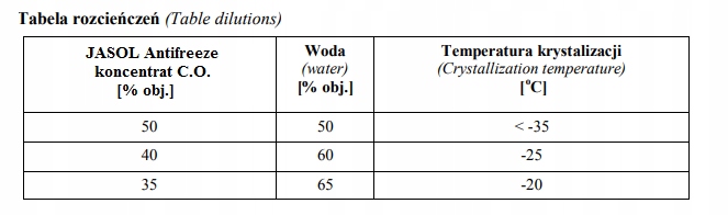 Використовується також в установках центрального опалення. і кондиціонер. Ступінь розведення слід вибирати залежно від бажаної температури кристалізації відповідно до таблиці розведення, наведеної нижче. Готова рідина змішується з іншими охолоджувачами на основі етиленгліколю.