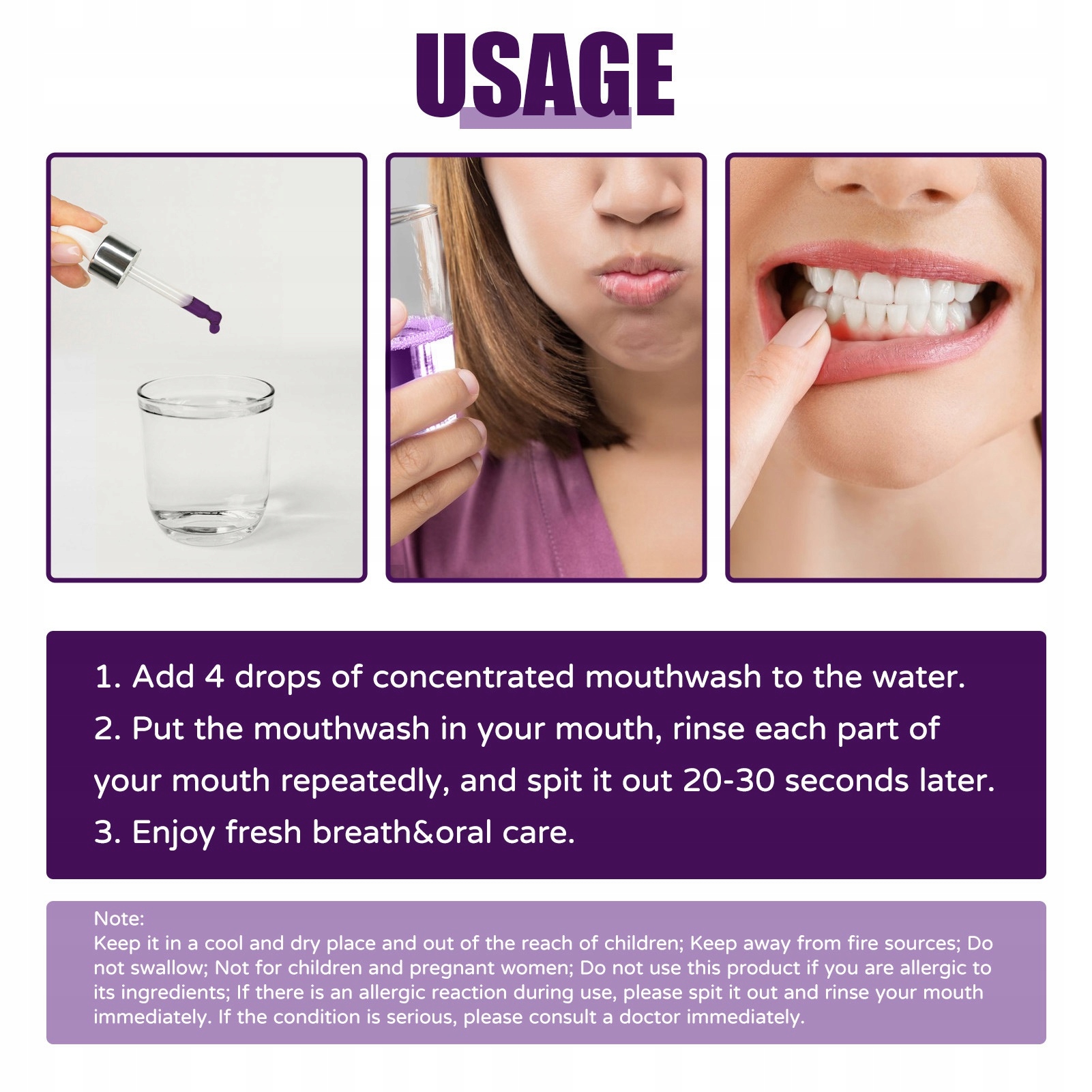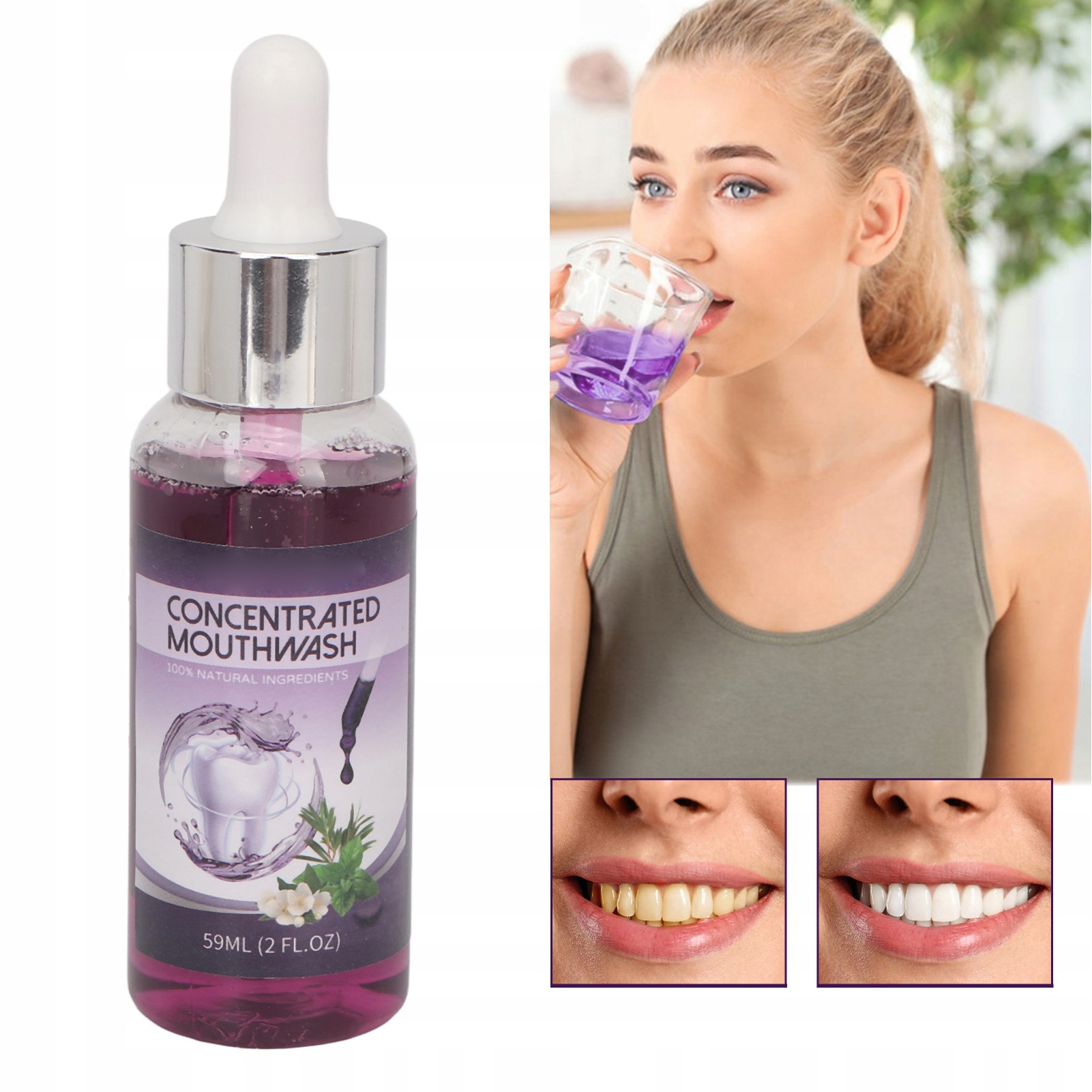 4. Простий у використанні: Додайте 4 краплі концентрованого басейну, щоб стукати рота до 300 мл води. У роті стукають по роті, пропустіть губи кілька разів і виплюнуть через 20-30 секунд.