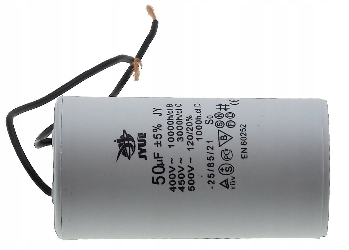 Пусковий конденсатор JYUL ємністю 50 мкФ і номінальною напругою 450 В змінного струму. Оснащений кабелями довжиною 50/95 мм для легкої установки. Ідеально підходить для використання в електродвигунах та інших пристроях, що потребують підтримки запуску.