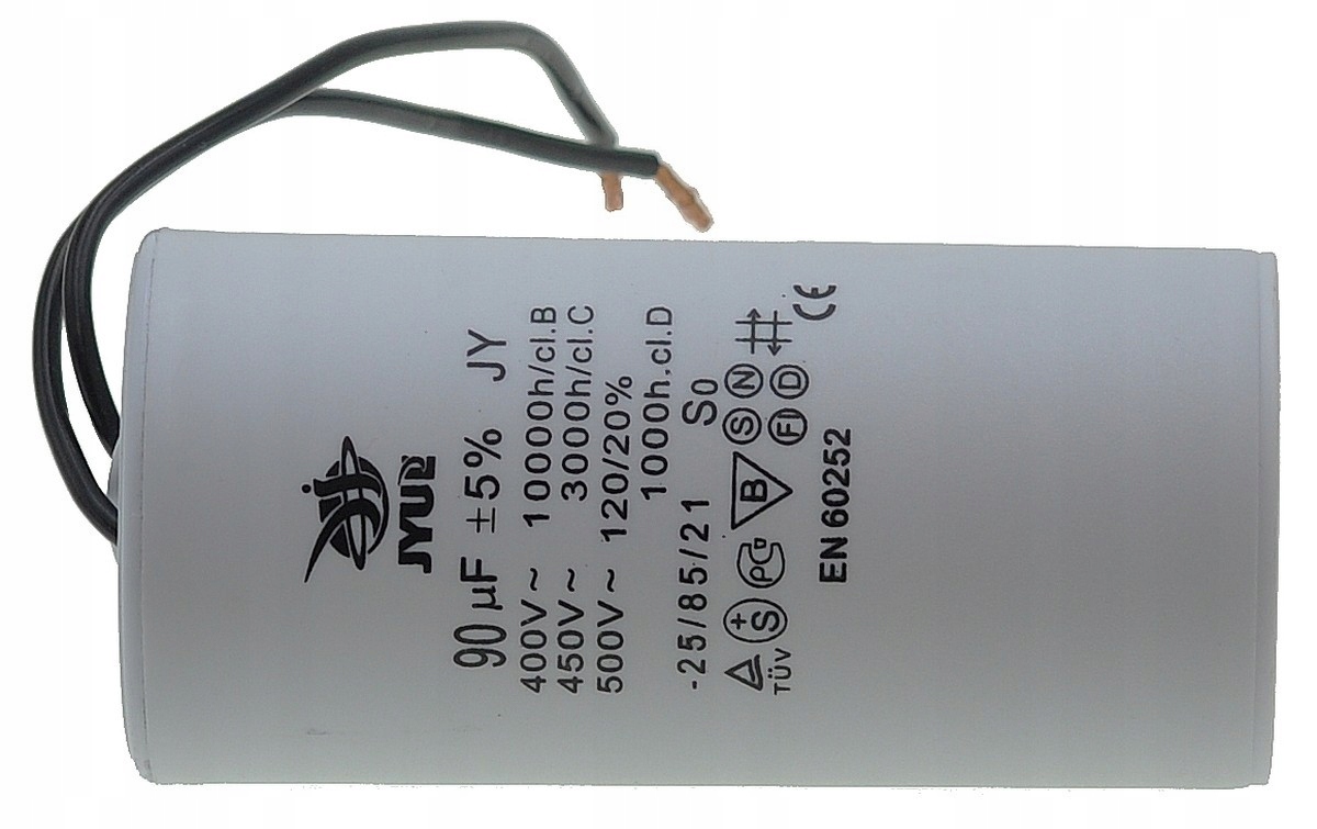Пусковий конденсатор JYUL ємністю 90 мкФ і номінальною напругою 450 В змінного струму. Оснащений кабелями довжиною 60/123 мм для легкого встановлення. Ідеально підходить для використання в електродвигунах та інших пристроях, що потребують підтримки запуску.