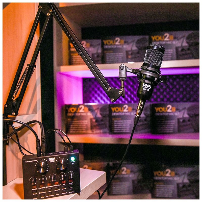 DNA YOU2B - дуже хороший набір для запису звуку на комп'ютері та різноманітних живих записів. Він ідеально підходить для запису подкастів, стрімів, текстів за кадром, контенту для сайтів соціальних мереж, а також вокалу та різних типів акустичних інструментів. У комплект входить конденсаторний мікрофон, протиударний тримач мікрофона, два шумопоглинаючі фільтри, штанга для легкого встановлення та роботи з мікрофоном, а також портативний зовнішній аудіоінтерфейс з можливістю бездротової роботи від акумулятора, з додатковими вбудованими звуковими ефектами (наприклад, сміх, оплески аудиторії), що робить YOY2B також ідеальним робочим інструментом для мобільних діджеїв.