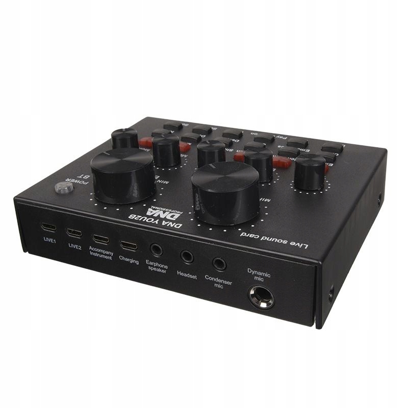 Аудіоінтерфейс DNA YOU2B оснащений підтримкою Bluetooth, тож ми можемо підключатися до нього через наш смартфон, планшет, ноутбук чи інший пристрій, надсилаючи аудіосигнал, а також 12 кнопок, які запускають звукові ефекти в режимі реального часу. Це сміх і оплески глядачів, вітання, звуки поцілунків і різні ефекти в стилі електро. Крім того, обладнання пропонує декілька ефектів модуляції звуку, а також двосмугову корекцію тону. Гучність вхідних сигналів можна незалежно регулювати за допомогою зручних поворотних потенціометрів. Основний мікс і рівень ефекту луни на сигналі також контролюються окремо, що особливо добре працює під час запису вокалу, додаючи йому характерний простір.