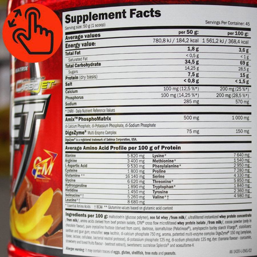 - Високоякісний протеїновий комплекс на основі білкового ізоляту CFM®. Забезпечує максимальне живлення м'язів, скорочує період регенерації і виключає появу хворобливості після тренувань. Поєднання кількох джерел білка робить добавку добре збалансованою та ефективно виконує свою роль, адаптуючись до потреб різних спортсменів. Amix Carbo Jet Gain піклується про аспекти здоров’я імунної та травної систем – він містить білкові фракції, а саме – бета-лактоглобулін, альфа-лактоглобулін, сироватковий альбумін, імуноглобулін, гломомакропептид, лактоферин, лактопероксидаза), які покращують функціонування травної системи та позитивно впливають на імунну систему. Недоступно в більшості конкуруючих продуктів.