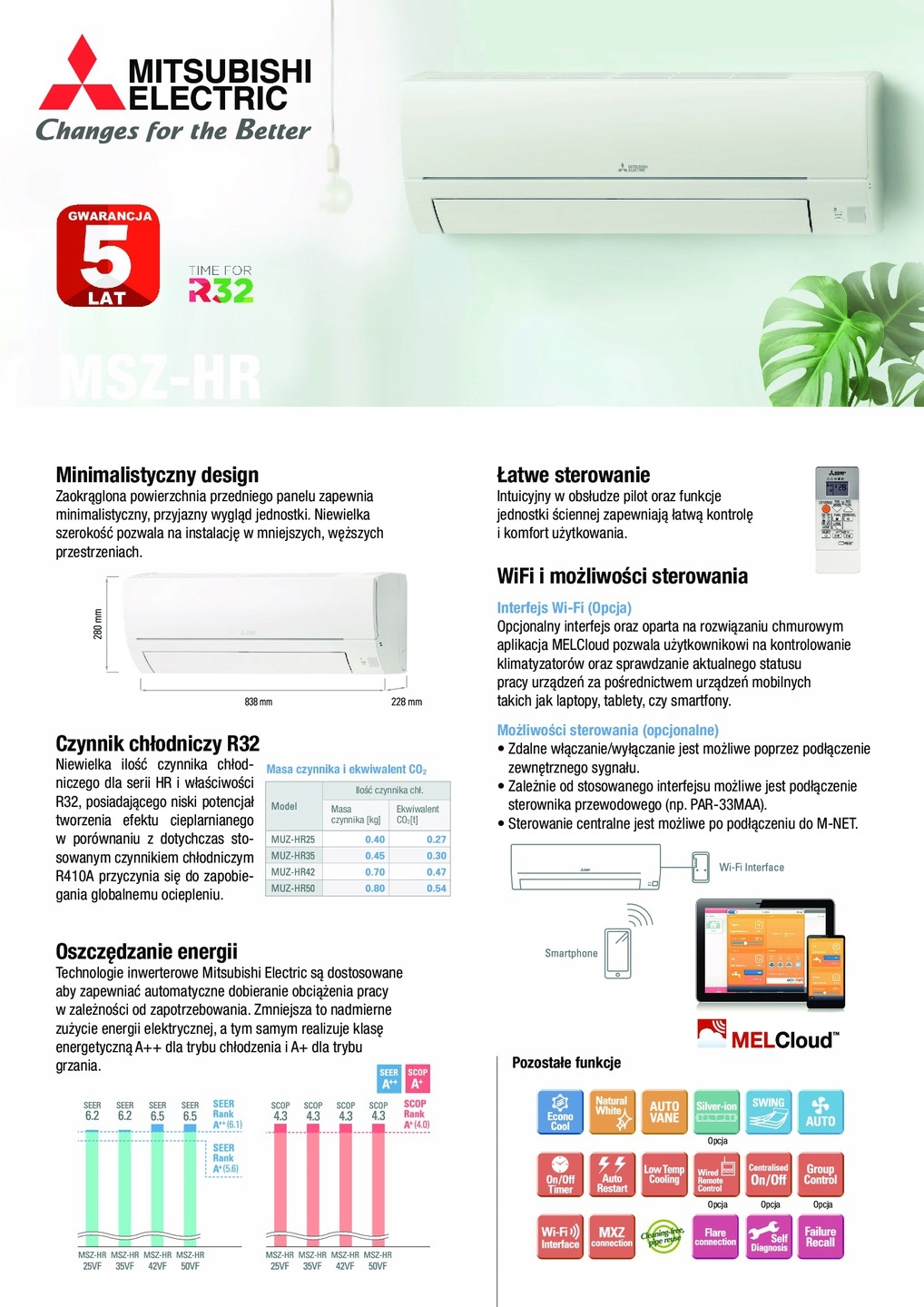 Інверторні технології Mitsubishi Electric адаптовані для забезпечення автоматичного вибору робочого навантаження залежно від попиту. Це зменшує надмірне споживання електроенергії і, таким чином, реалізує енергетичний клас A ++ для режиму охолодження I A+ для режиму нагріву. R410A сприяє запобіганню глобального потепління.
