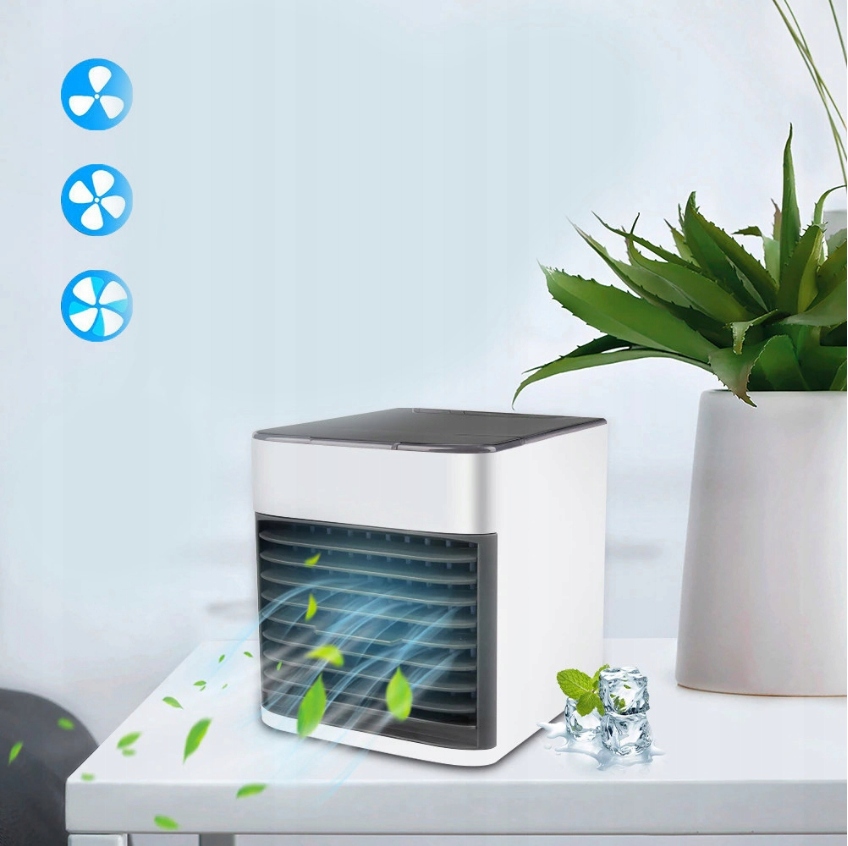 міні -кондиціонер - це пристрій, який буде чудово працювати в спекотні дні вдома або на роботі. Цей невеликий пристрій може значно знизити температуру в приміщенні . Завдяки невеликих розмірів його можна розмістити на столі, шафі або столі. Кондиціонер оснащений світлом барвистим освітленням, яке світить зміною кольорів.